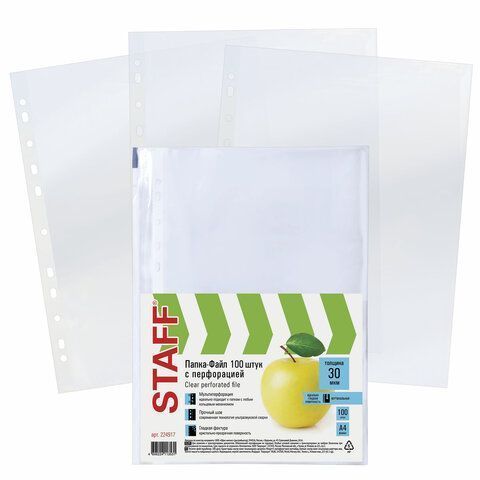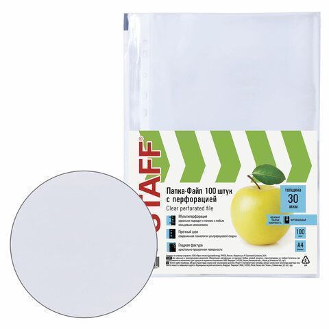Перфофайлы А4 30 мкм гладкие STAFF 100шт яблоко 1/30 купить оптом и в розницу в Нижнекамске