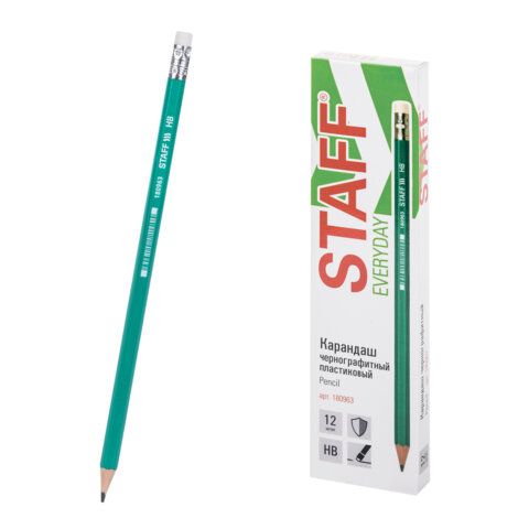 —Карандаш ч/гр НВ пластиковый, зеленый корпус, с резинкой, заточенный STAFF 1/12/288