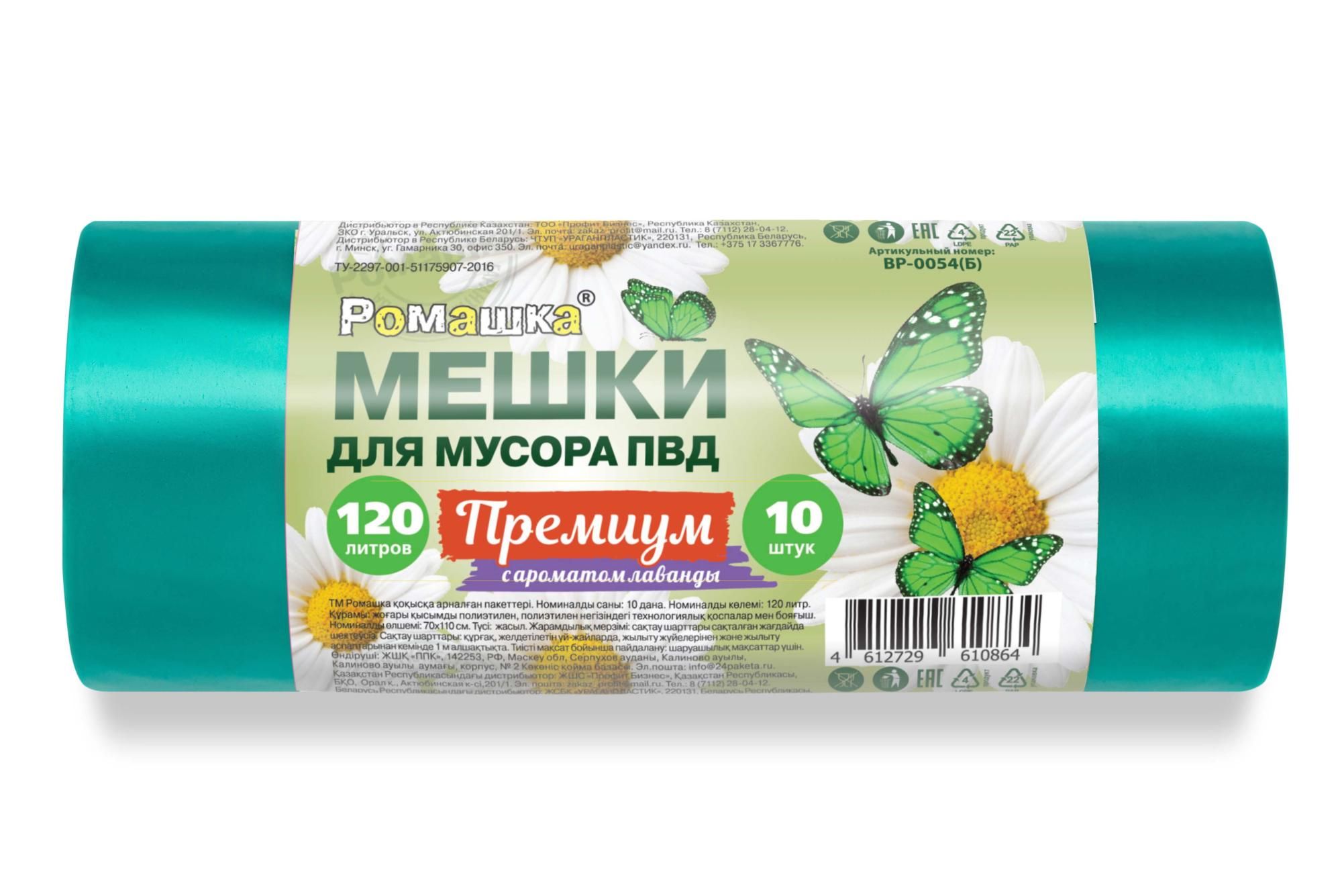 Мешок для мусора 120л рулон ПВД (70х110)-35 зеленый (лаванда) ПРЕМИУМ 50г Ромашка (10 шт) 1/12 купить в Нижнекамске с доставкой оптом и в розницу