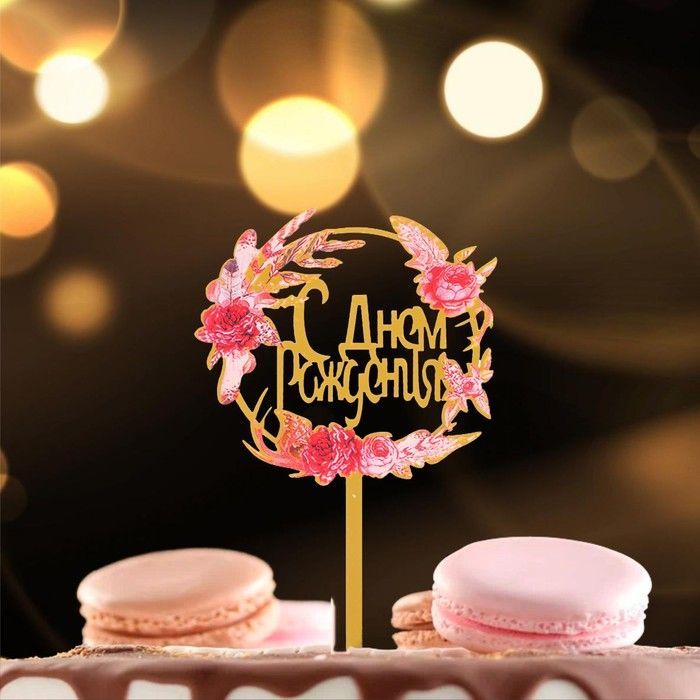 Топпер для торта С днем рождения! золото цветы 1/1 оптом и в розницу в Нижнекамске, цены в каталоге с доставкой